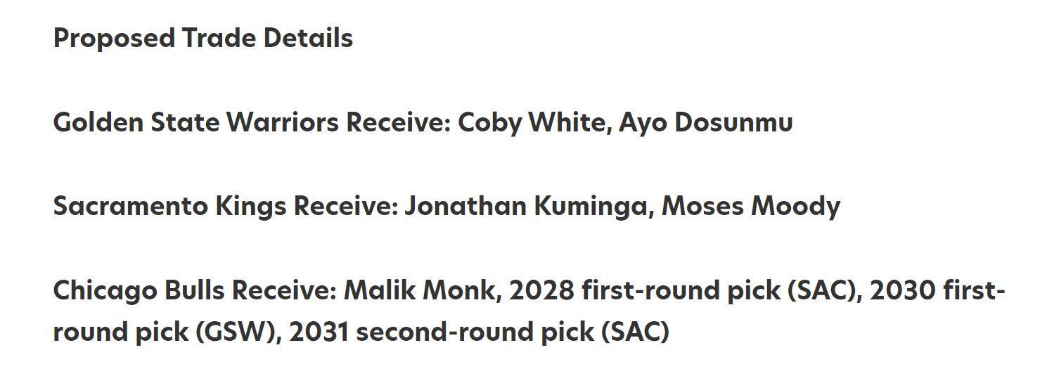 公牛得到:蒙克+28年国王首轮+30年勇士首轮+31年国王次轮。