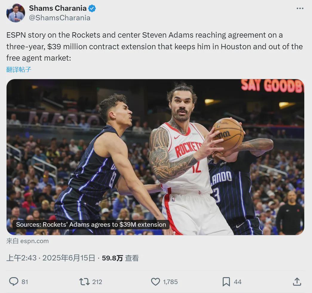 北京时间6月15日,NBA名记Shams报道,亚当斯3年3900万美元和火箭续约,他不会进入自由市场。这是一份完全保障合同,薪资逐年递减:2025-26赛季,1413万美元;2026-27赛季,1300万美元;2027-28赛季,1187万美元。